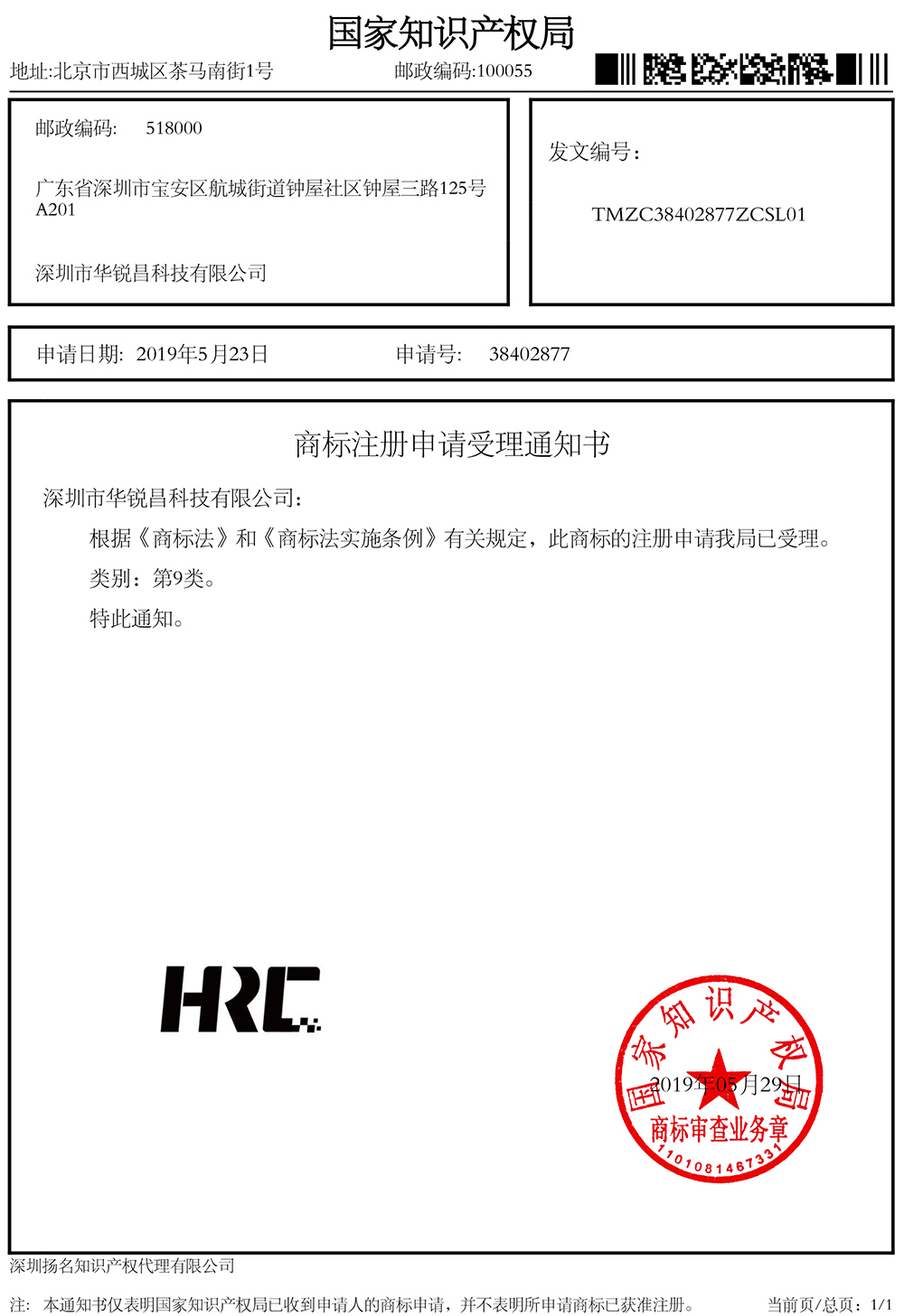 “HRC ”商標(biāo)注冊(cè)品牌受理通知書(shū)
