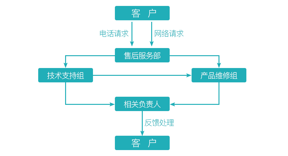 2、無(wú)論客戶是電話請(qǐng)求還是網(wǎng)絡(luò)請(qǐng)求,客服中心都會(huì)根據(jù)客戶反饋的問(wèn)題進(jìn)行分類后直接轉(zhuǎn)接相應(yīng)部門,部門負(fù)責(zé)人會(huì)根據(jù)客戶請(qǐng)求進(jìn)行處理并給出相應(yīng)解答,處理結(jié)果將會(huì)交接給區(qū)域負(fù)責(zé)人,區(qū)域負(fù)責(zé)人將問(wèn)題反饋給客戶并配合處理一切售后事務(wù)。
