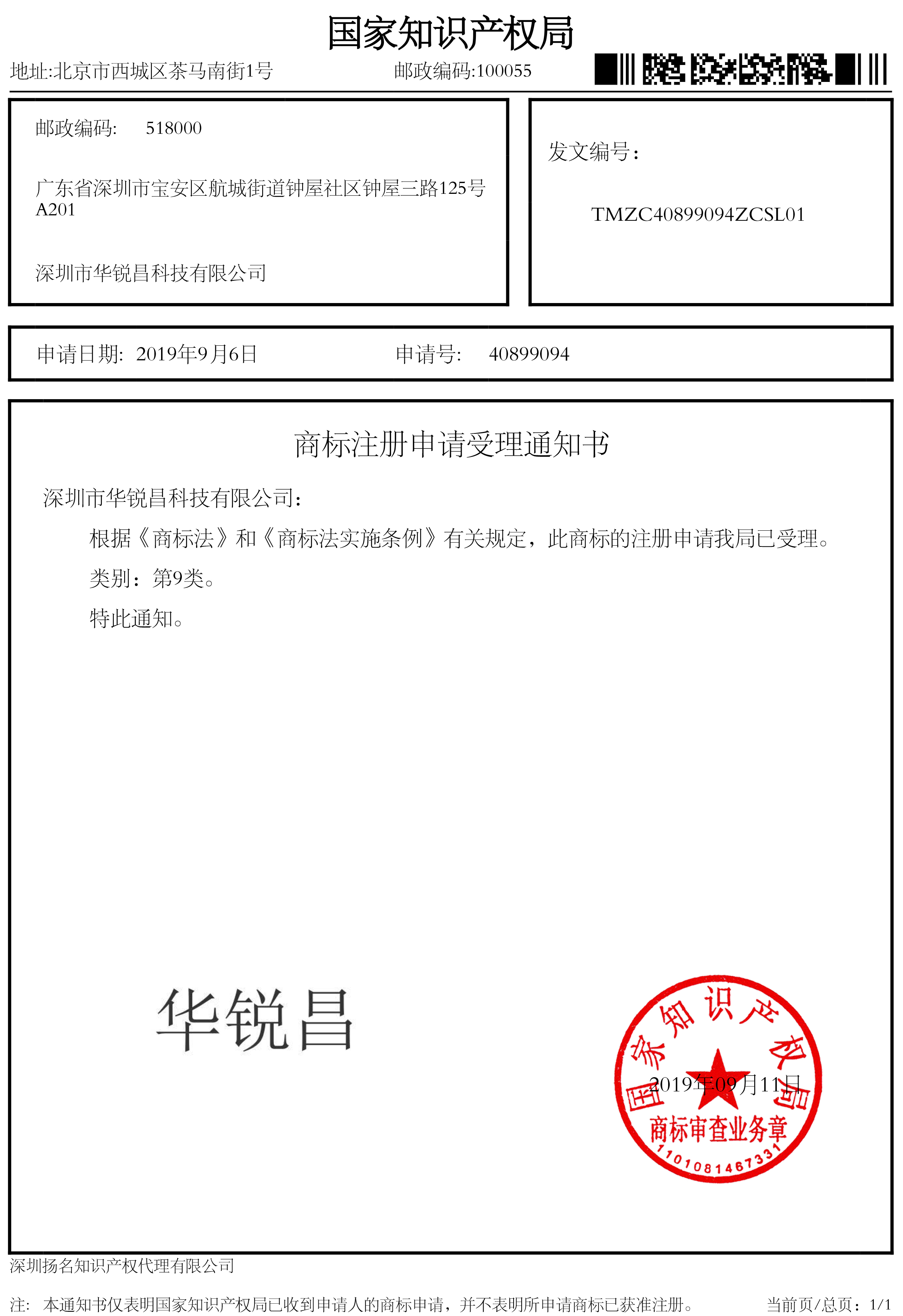 “華銳昌”商標(biāo)注冊品牌受理通知書